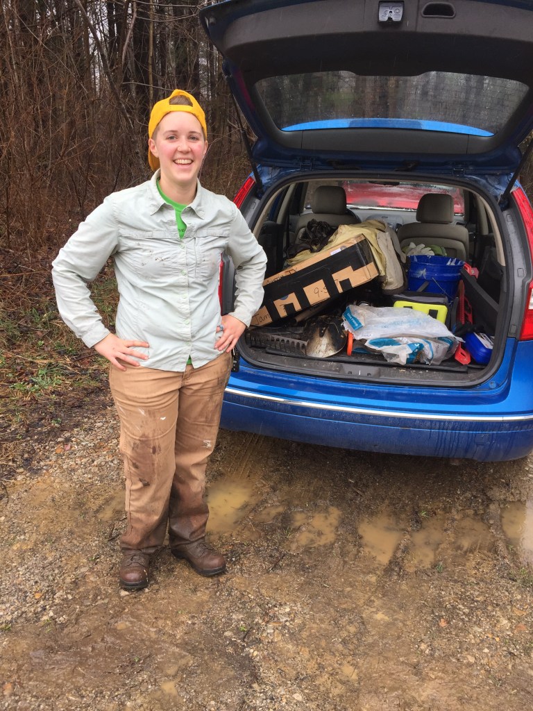 Dad’s truck got stuck in some deep mud and Aunt G spent an hour trying to dig him out while I trekked all of our gear down to the cabin build site.